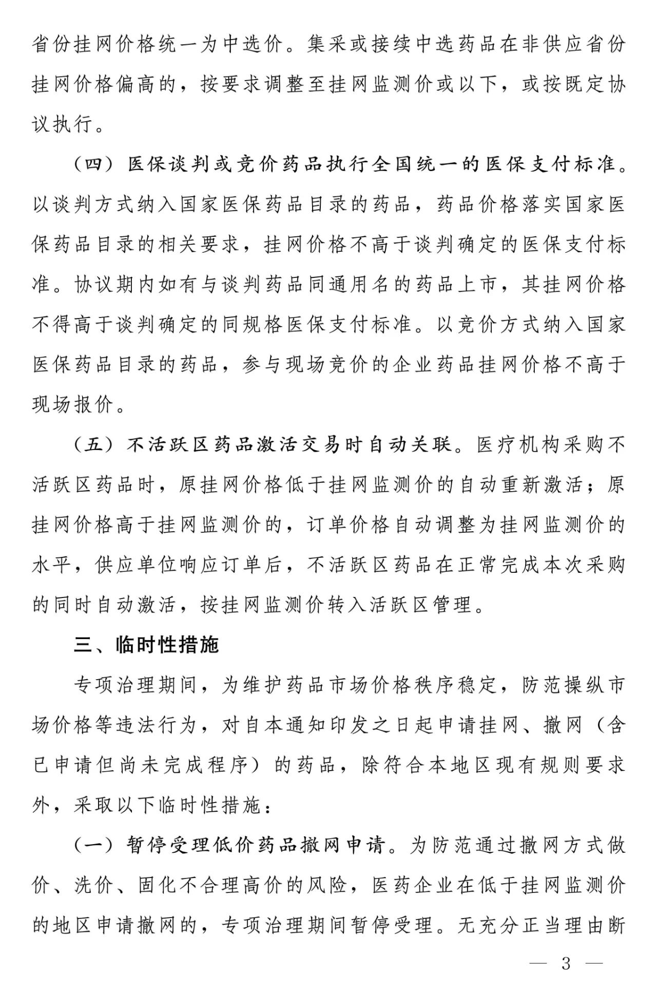 本次药品挂网价格治理,也同样把增进市场公平竞争、维护良好价格秩序作为最根本的出发点,强调纠偏和止损,推动价格公平诚信、透明均衡,不是片面追求降价。监测价不是对标全国最低价格,而从现有的交易价格出发,使用统计方法,用中位数、众数等把具有公允性的交易价格找出来。监测价本身是企业自主制定、能够保障供应的价格水平,在企业可承受范围内。对企业来说,是均衡区域间价格,是局部纠偏,不会出现普遍大幅降价情况。