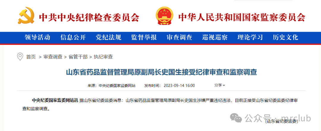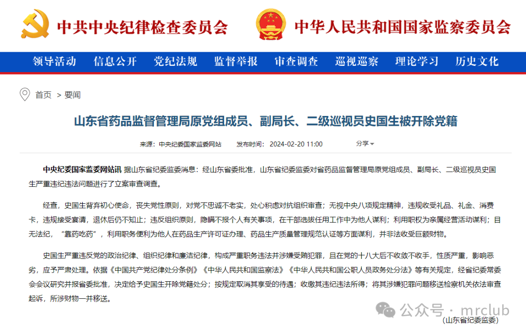 2 月 20 日,中央纪委国家监委网站发布了对山东省药品监督管理局原党组成员、副局长、二级巡视员史国生严重违纪违法问题立案审查调查的结果。