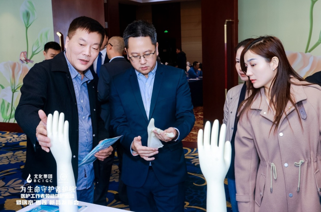 (大会现场,与会人员体验“雪莲”系列微创手术手套新品)