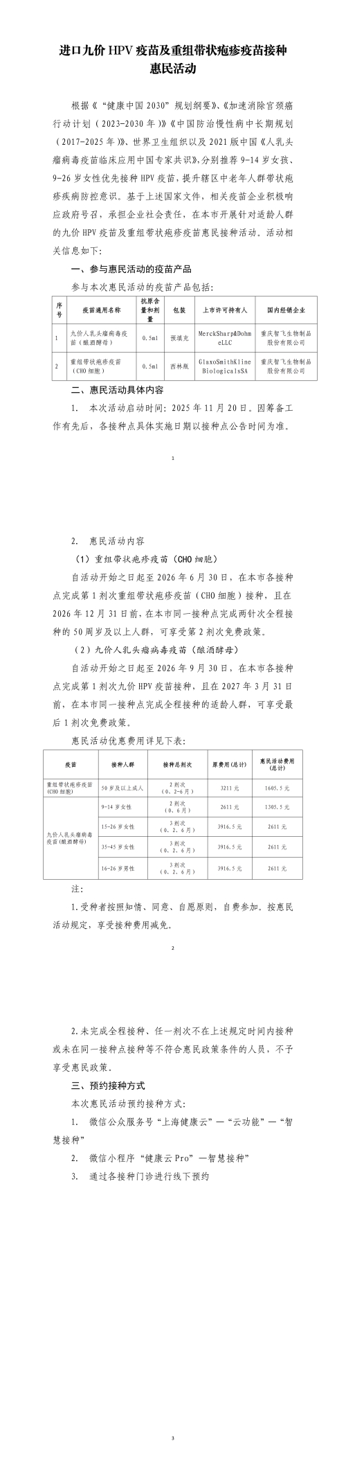 进口九价HPV疫苗及重组带状疱疹疫苗接种惠民活动信息