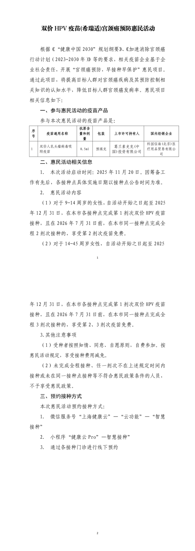 本市部分非免疫规划疫苗接种惠民活动于2025年11月20日启动