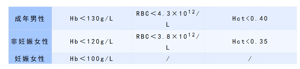 依据WHO及中国贫血防治指南,成人贫血诊断标准: