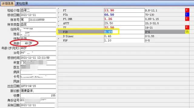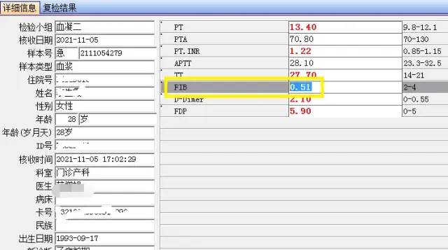 2021年11月5日,在审核凝血六项报告时,发现一例门诊产科患者的纤维蛋白原(fibrinogen,FIB)结果为0.51g/L,产科患者如此低的FIB引起了我们的关注。