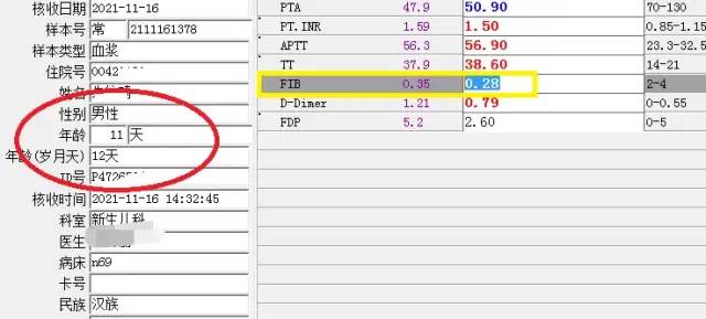 患者的孩子出生了,因患者有产前子痫的症状又合并心功能不全,经剖宫产术产一男婴,因黄疸住新生儿科,婴儿第一次FIB检测值为1.01g/L,偏低,因新生儿因生理原因偏低,最初庆幸婴儿可能没有遗传母亲的异常纤维蛋白原血症的基因,可是后面的检测结果依然不容乐观: