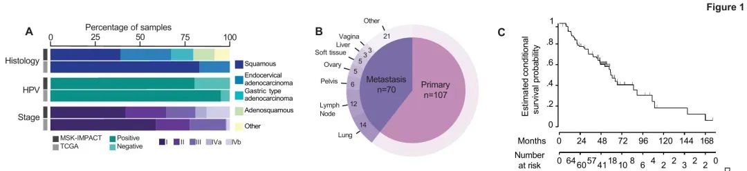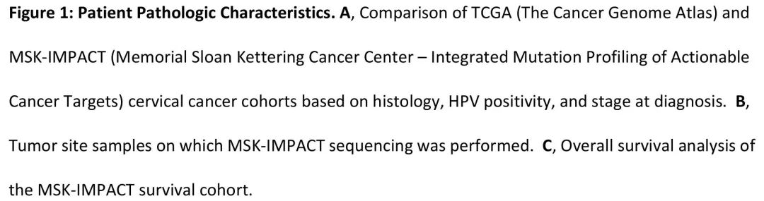 本研究也有局限性。虽然我们的结果与TCGA类似,但由于整体样本量小和分析的回顾性,存在局限。此外,本研究是在一家拥有大量转诊基础的三级癌症中心进行的,导致罕见组织学亚型患者以及晚期或复发性疾病患者的比例过高。最后,虽然该队列中18%的患者入组了临床试验,但这不仅受到测序结果的影响,还受到多样和活跃的临床试验的影响,这可能取决于地点。尽管存在这些局限,我们对MSK宫颈癌队列的分析为宫颈癌患者中不同组织学亚型的基因特征多样性提供了额外的证据,表明基因检测可以为临床决策提供信息,为部分宫颈癌患者新型治疗选择提供依据。