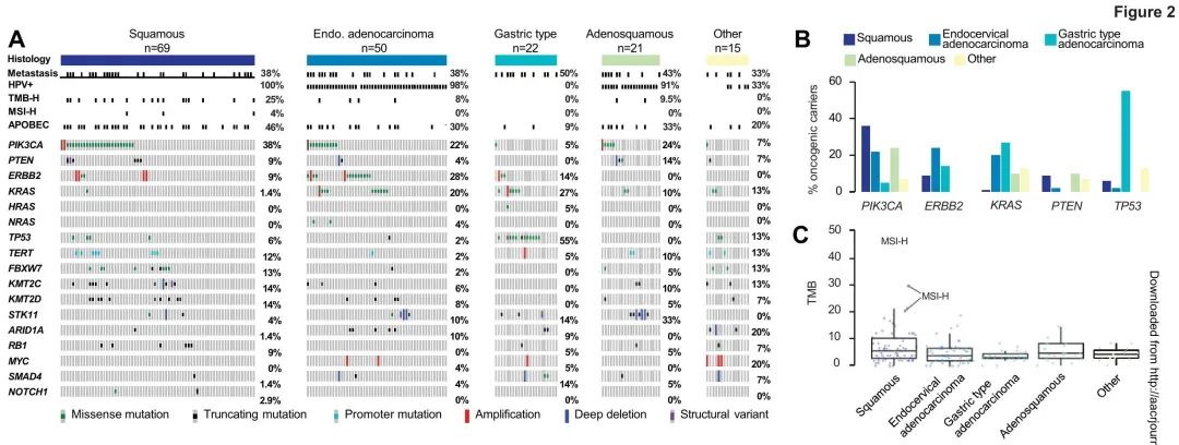 世界卫生组织(WHO)分类系统识别了宫颈癌的几种组织学亚型。鳞癌(SCC)是主要的组织学亚型,约占所有宫颈癌的75%。腺癌和腺鳞癌占10-15%,其余10-15%为“其他”或未指明的组织学。根据监测、流行病学和最终结果(SEER)数据库的临床数据,小细胞癌和腺癌是与最差生存率相关的组织学亚型。与其他常见的实体瘤相比,宫颈癌基因数据的预测和预后价值仍不明确。癌症基因图谱(TCGA)鉴定了宫颈癌中显著突变的14个基因,包括PIK3CA、ARID1A和KRAS,以及APOBEC突变特征。虽然这是一个重要的里程碑,但TCGA分析中包含的肿瘤样本主要收集自早期SCC患者(n = 144),很少有肿瘤表现出腺鳞癌(n = 3)或腺癌(n = 31)组织学。之前分析的其他队列包括来自挪威和墨西哥的115例女性,以及来自乌干达的118例女性,这些队列也主要为SCC。因此,关于非鳞状宫颈癌(包括宫颈胃型腺癌(GEA)和宫颈小细胞癌)基因图谱的数据有限。此外,没有研究评估晚期宫颈癌患者对肿瘤+正常配对样本进行前瞻性分子检测的可行性,以及肿瘤基因检测指导临床治疗的潜在效用。