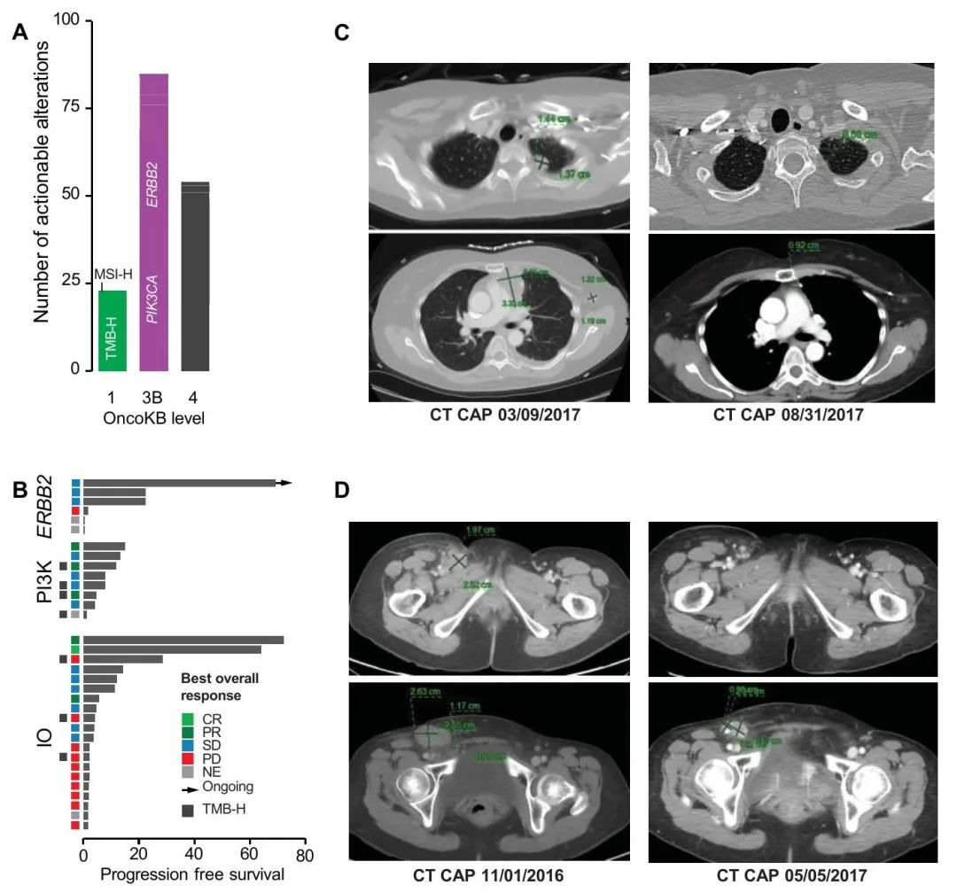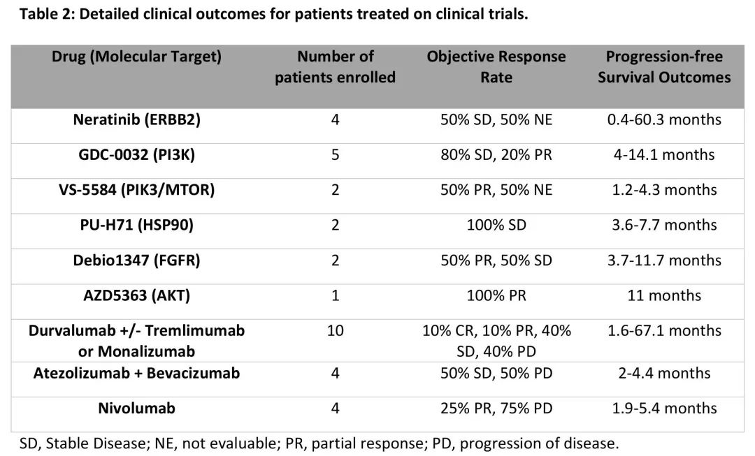 37%的患者(66/177)至少有一个OncoKB® 3B级潜在可治疗变异(图3A),最常见的是PIK3CA(45,25%)和ERBB2(17,9.6%)。值得注意的是,3例患者携带致病性体细胞BRCA1(n = 1,无杂合性缺失)或BRCA2(n = 2,1例杂合性丧失)变异。数据锁定时,30例患者(17%)参加了治疗性临床试验,其中11例患者参加了不止一项研究。18/177例患者(10%)基于其MSK-IMPACT肿瘤基因检测结果与临床试验相匹配,包括6例基于ERBB2变异,6例基于PIK3CA变异(4例接受GDC-0032治疗),2例基于FGFR变异,以及各种其他靶标,包括ERK和TP53(图3B,表2)。值得注意的是,一例ERBB2 D769N突变的患者参加了人表皮生长因子受体(HER)激酶抑制剂临床试验,获益显著,已在试验中超过5年(图3B)。