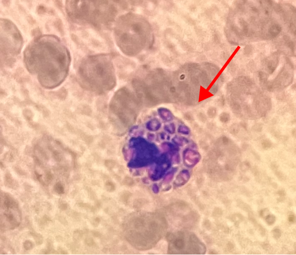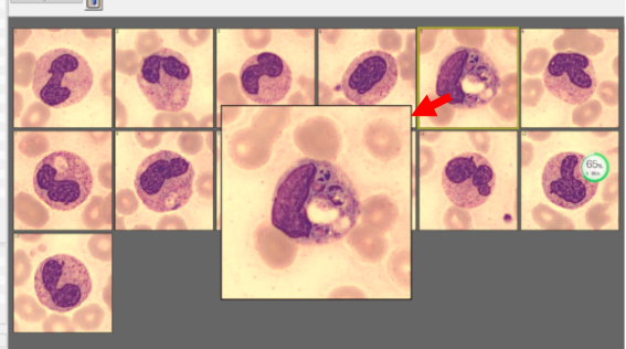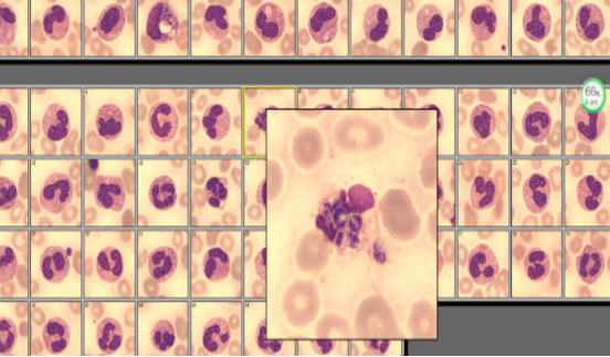 由于三系减低且仪器报警提示散点图异常,触犯复检规则,需镜检复核。虽然白细胞数极低,但依然在DI-60阅片系统上捕捉到较多中性粒细胞,并发现了一些吞噬异物的细胞(见图2)。同时在显微镜下人工复核,亦可见此类细胞。被吞噬物呈卵圆形、腊肠形或不规则形,紫红色核1-2个,中间有明显的无色横隔,形态上似马尔尼菲篮状菌(Talaromycesmarneffei,TM)。