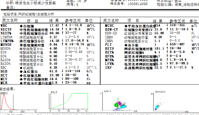 而血细胞分析+网织红细胞对血小板的计数采用的是PLT-O模式,该模式采用的是光学法,可在很大程度上纠正小红细胞、红细胞碎片及血小板聚集等对血小板计数的干扰,该病例第二天复查血细胞分析并带网织红细胞计数,得到血小板的实际结果。