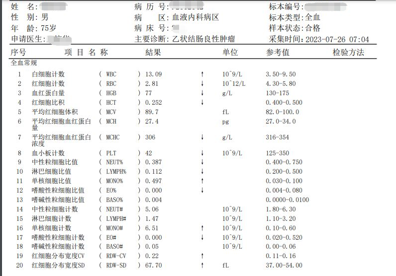 患者,男,75岁,2月前新冠感染康复后自觉食欲较前下降,减至一半,无腹痛、腹胀、恶心呕吐、腹泻等消化道症状。未予诊治,随后出现体重逐渐下降,于2023年7月到当地医院就诊。CT提示:“回肠下段及回盲部肠壁增厚并局部肠套叠”,怀疑肿瘤性病变。患者为进一步明确诊断来我院就诊。血常规检验结果见图1: