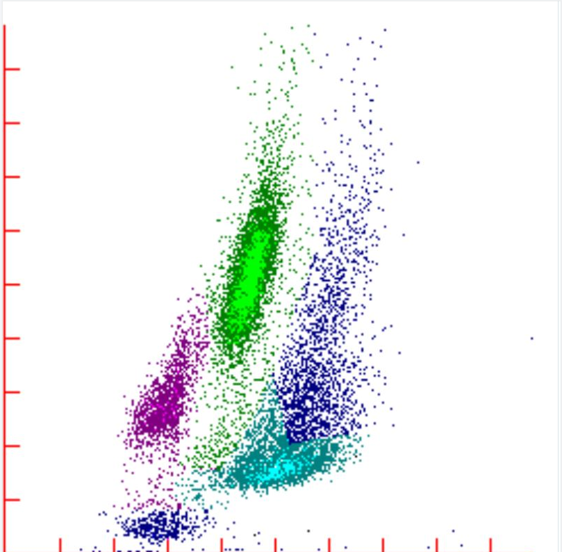 不成熟单核细胞属于较成熟阶段的单核细胞,在希森美康XN系列仪器中与成熟细胞统一划为一类细胞。另外,当原始细胞比例较低时,血常规散点图不会出现较大的异常,不易引起检验人员的重视(见图1)。