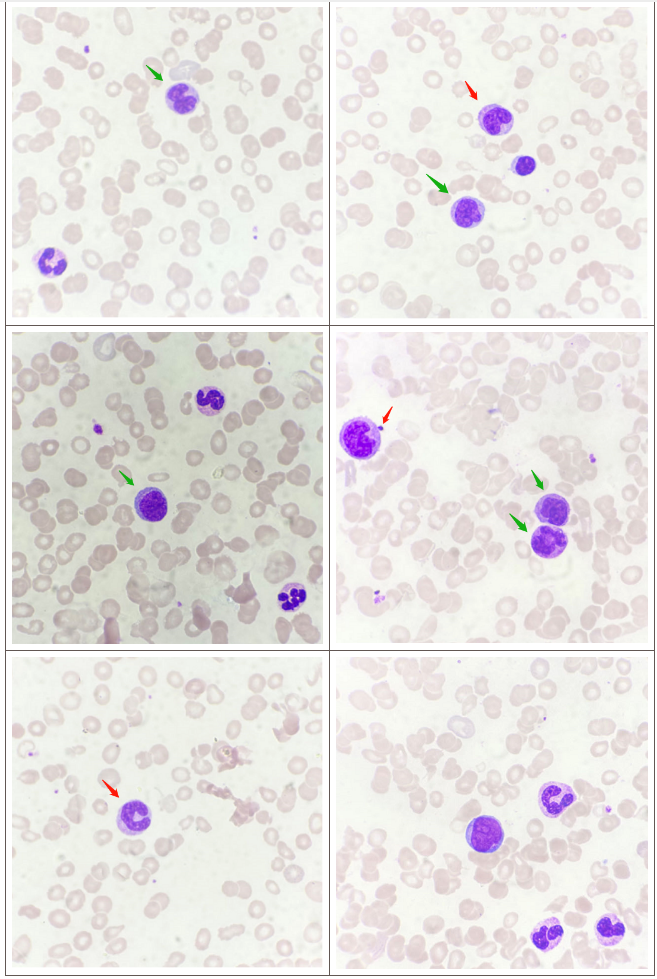 图2 绿色箭头考虑为未成熟单核细胞、红色箭头成熟单核细胞
