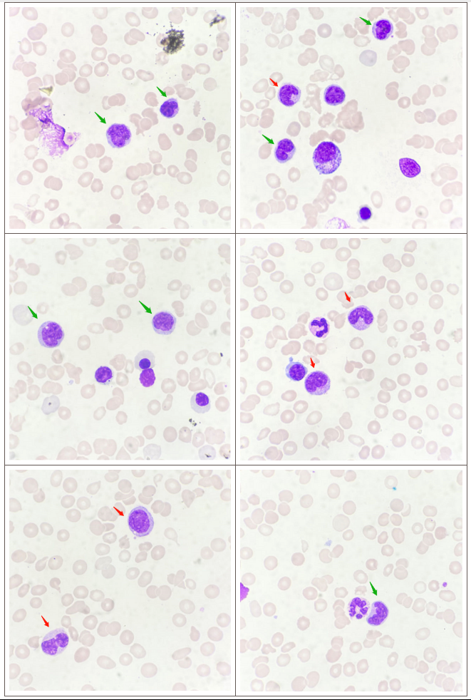 图3 绿色箭头考虑为未成熟单核细胞、红色箭头成熟单核细胞