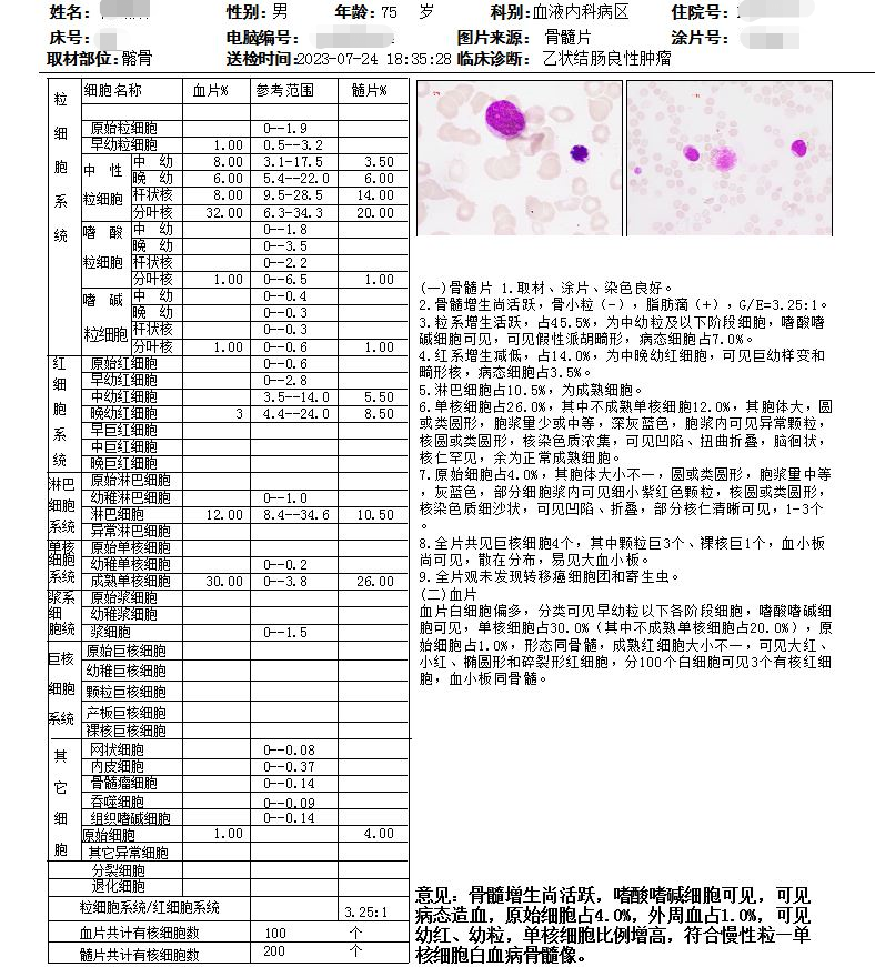 血片意见:白细胞偏多,分类可见早幼粒以下各阶段,嗜酸嗜碱细胞可见,单核细胞占30%(其中不成熟单核细胞占20.0%),原始细胞占1.0%,成熟红细胞大小不一,可见大红、小红、椭圆形和碎裂形红细胞,分类100个白细胞可见3个有核红细胞。