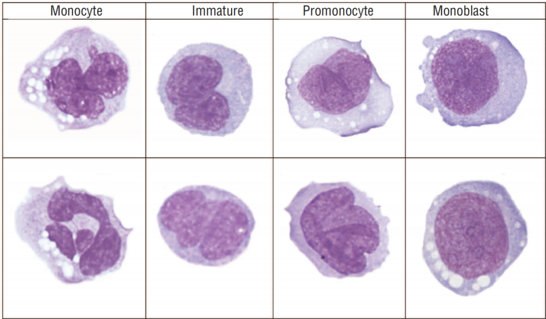 不成熟单核细胞是一类介于幼稚和成熟阶段单核细胞(图5竖二排),具有以下几个特点[1]:核桨比较大、核不规则扭曲、染色质不均与聚集、胞质颗粒异常,嗜碱性介于原幼单核细胞和成熟单和细胞之间,胞浆与同一骨髓或外周血中成熟的单核细胞比较颜色更深。