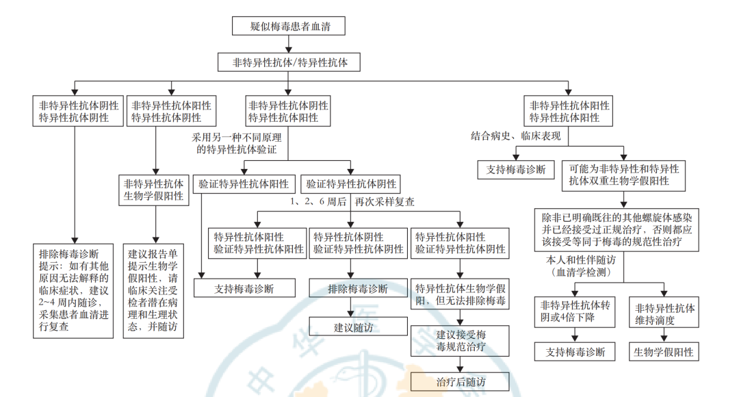 (3)初筛试验阳性/验证试验阳性,可以支持梅毒诊断。对其中排除梅毒诊断的,建议临床定 期随访;而无法排除梅毒进行试验性治疗的,建议治疗后进行本人和性伴随访,进行梅毒血清学监测以明确诊断。