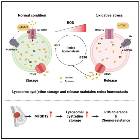 2023年9月25日,中山大学林楚勇团队在Molecular Cell 在线发表题为“Lysosomal cyst(e)ine storage potentiates tolerance to oxidative stress in cancer cells”的研究论文,该研究发现乳腺癌细胞上调含有12的主要促进物超家族结构域(MFSD12),以增加溶酶体胱氨酸/半胱氨酸的储存,而溶酶体胱氨酸/半胱氨酸由L-胱氨酸转运蛋白(CTNS)释放,以维持GSH水平并缓冲氧化应激。