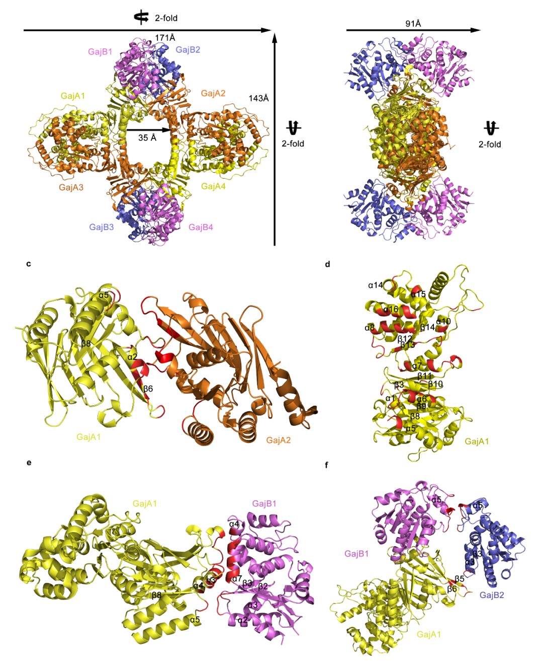 2024年1月29日,中国科学院生物物理研究所卫涛涛研究组联合深圳湾实验室马军研究组及生物物理研究所章新政、许文青研究组在Nature Communications发表了题为Structural and biochemical insights into the mechanism of the Gabija bacterial immunity system的研究论文,报道了Gabija八聚体复合物的结构,阐明了Gabija系统发挥免疫防御作用的分子机制。Gabija复合物是由四个GajA蛋白和四个GajB蛋白组成的八聚体(图 1)。GajA蛋白首先形成四聚体,构筑Gabija复合物核心组件;四个GajB蛋白分别以单体的形式结合在复合物的外周。大肠杆菌抗噬菌体侵染实验证明,在细菌中单独表达GajA蛋白或GajB蛋白均无法抵抗噬菌体的入侵,而破坏GajA蛋白和GajB蛋白的相互作用界面也明显减弱Gabija复合物的抗噬菌体功能,提示4:4 组装的GajA/B复合物对抵御噬菌体至关重要。