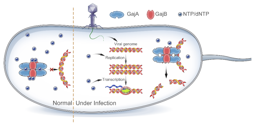 该研究还发现Gabija复合物具有序列特异性的DNA内切酶活性,并更倾向于选择环状DNA作为底物,且其内切酶活性对核苷酸浓度的响应比单独的GajA蛋白更敏感。GajB蛋白中ATP酶结构域关键位点的突变能够解除核苷酸对于Gabija复合物DNA内切酶活性的抑制,提示GajB可作为细胞能量状态的感受器,通过响应胞内核苷酸的浓度,精确调节GajA蛋白的核酸酶活性。基于冷冻电镜结构解析及生化实验,该研究提出了Gabija免疫系统发挥抗病毒作用的模型:在正常生理状态下,细胞内的NTP和dNTP浓度较高,抑制了Gabija复合物的核酸内切酶活性;而在噬菌体入侵、病毒DNA高强度复制和转录时,细胞内的NTP和dNTP耗竭,迅速激活Gabija复合物,该复合物首先切割环状DNA以抑制噬菌体DNA复制,进而阻断噬菌体扩增(图2)。