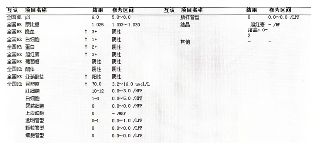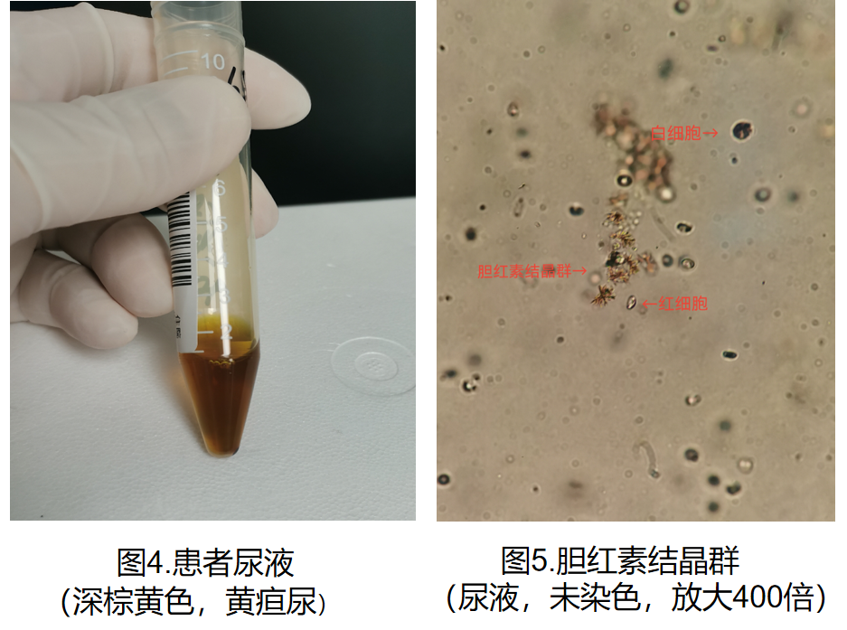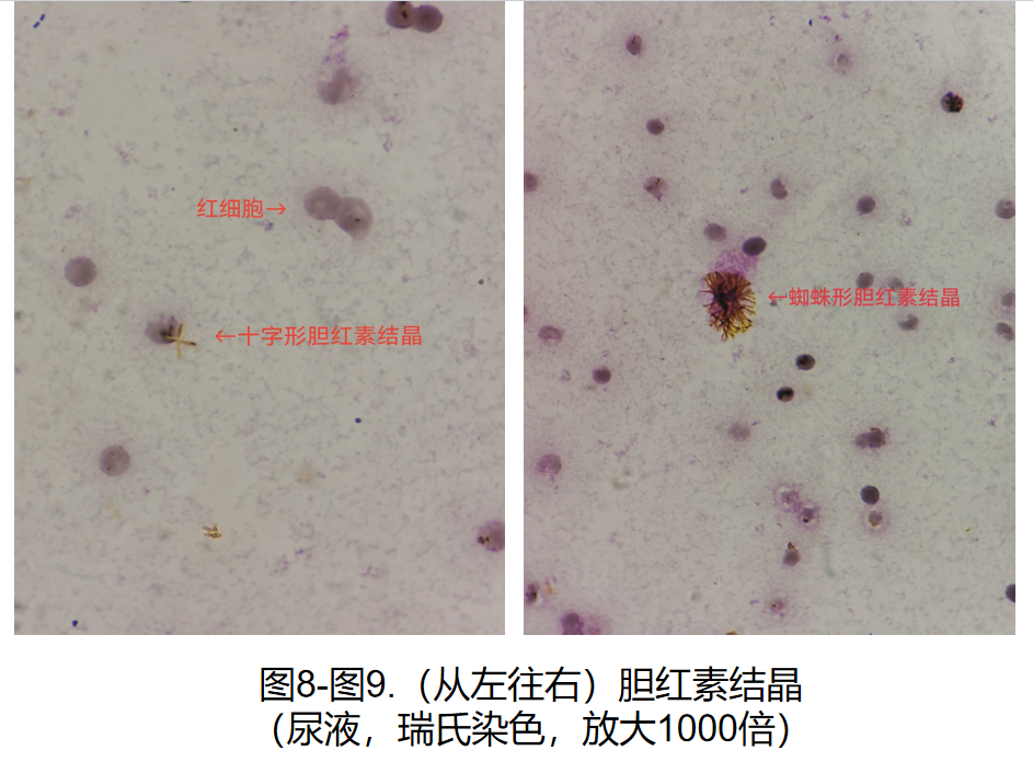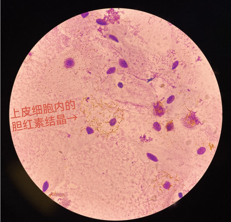 尿液常规:尿液呈偏酸性,PH为6.0。镜下可见红细胞、白细胞、透明管型;胆红素3+,胆红素结晶:0-2/HP,如图3-11。
