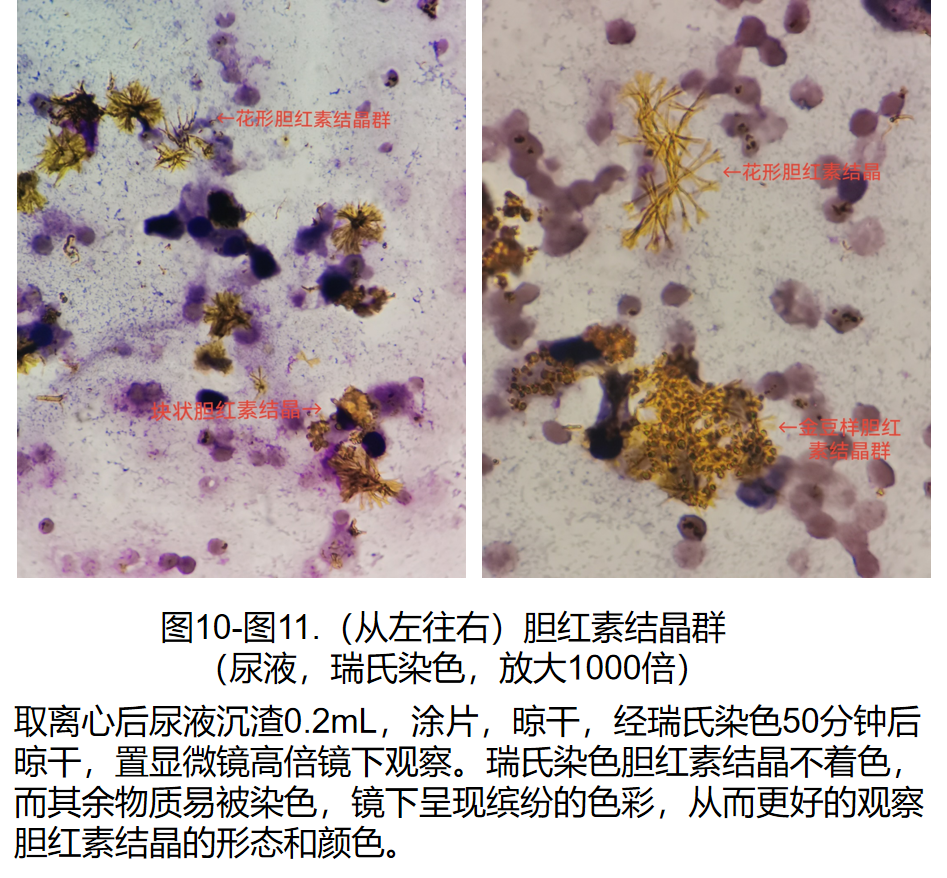 下面和大家分享几张以往的胆红素结晶图片,该病例为新生儿高胆红素血症,由于新生儿摄取、结合、排泄胆红素能力不足而引发的皮肤、黏膜黄染等症状,可伴发尿液胆红素结晶的出现。
