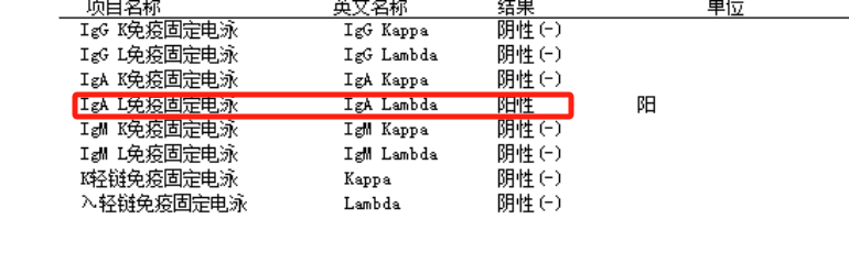 球蛋白和免疫固定电泳结果显示患者免疫球蛋白IgA异常增高,异常M蛋白为IgA λ型。