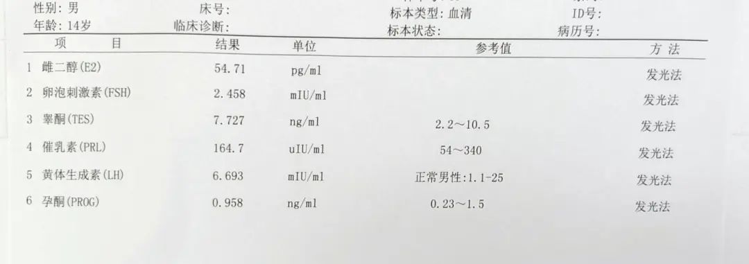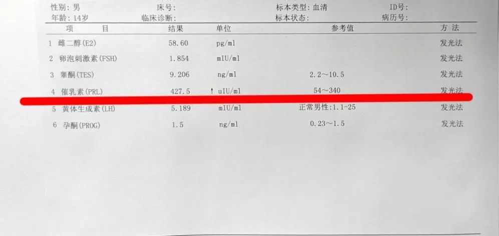 患者,男性,14岁,血清泌乳素水平偏高↑为427.25uIU/L(图1)。