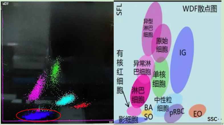 患者血常规WDF散点图与右侧示意图对比,影细胞位置右移且颜色较深,说明该类细胞颗粒较多。