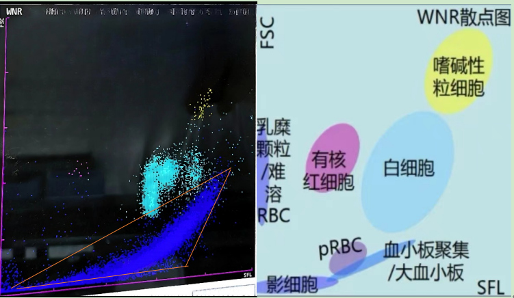 患者血常规WNR散点图与右侧示意图对比可见,影细胞位置散点明显增多并向上延伸至白细胞所在区域,好似向上翘起的“滑板”。