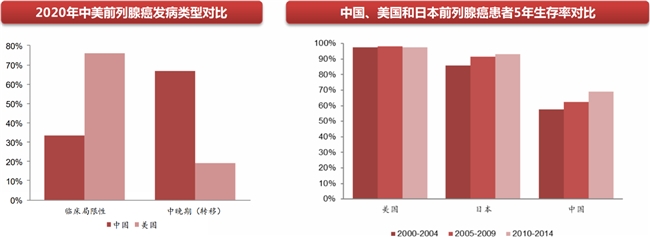 居高不下的发病率下,是我国前列腺癌患者较低的早期检出率以及5年生存率。《前列腺癌筛查中国专家共识》及柳叶刀数据显示,我国仅有3成的前列腺癌在早期发现,初诊时多数患者已处于中晚期,这也导致我国前列腺癌患者的5年生存率显著低于美国及日本。